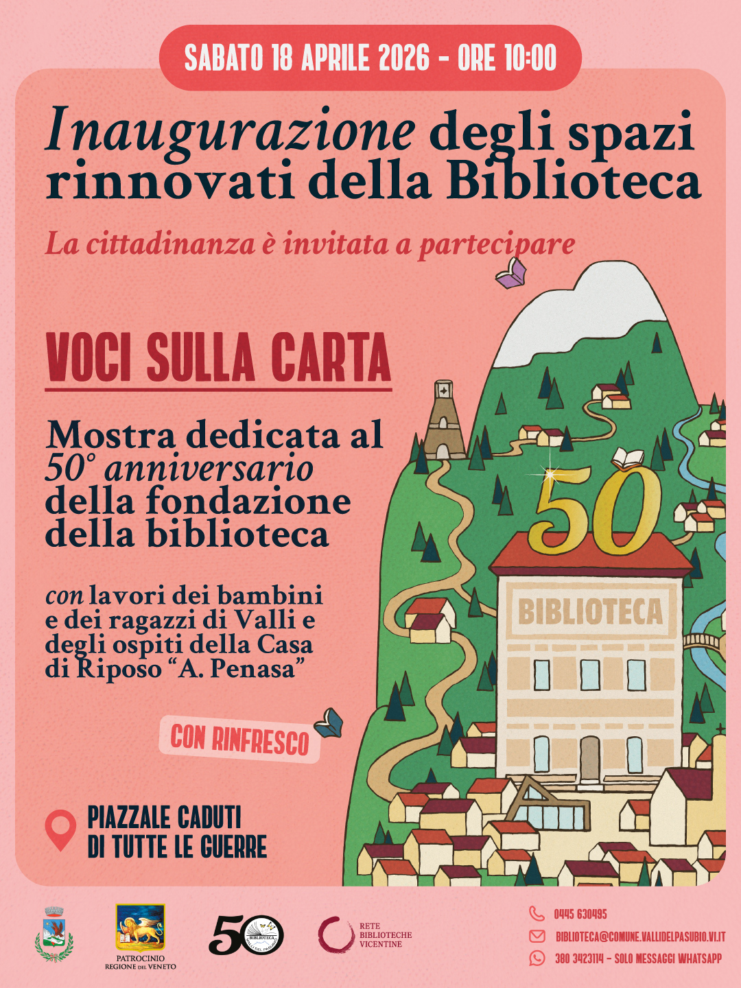 Evento istituzionale il 18 aprile dalle ore 10: inaugurazione dei locali rinnovati della biblioteca alla presenza di autorità e inaugurazione della mostra dei lavori realizzati da tutte le scuole del paese, dagli ospiti della casa di riposo "A. Penasa" e un momento dedicato ai partecipanti del contest social dedicato alla poesia.