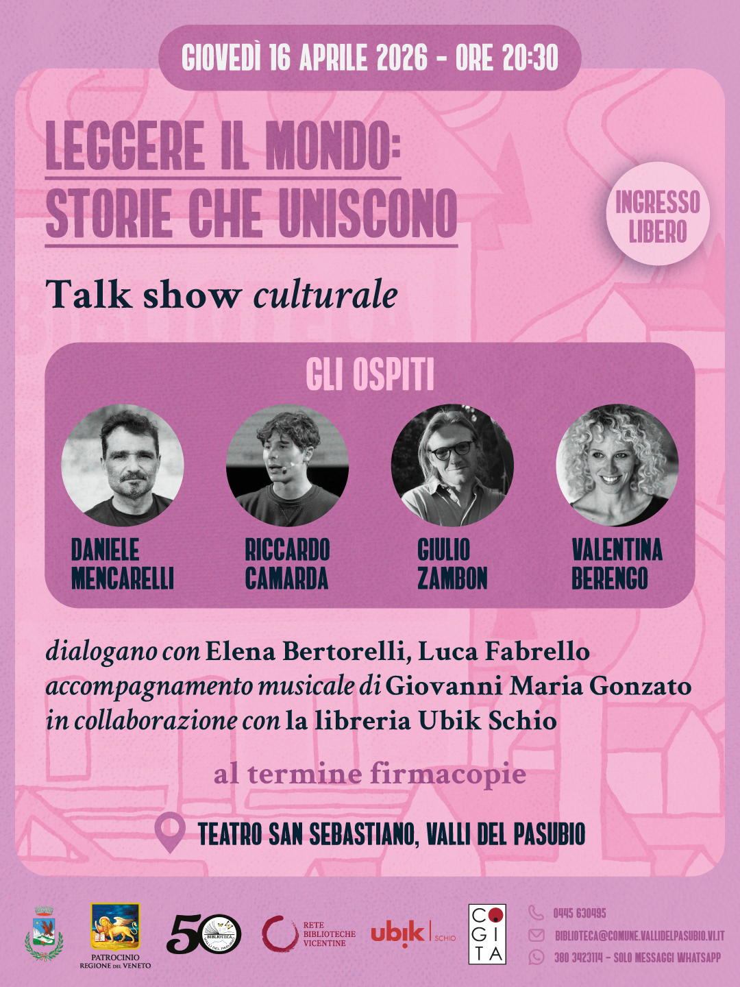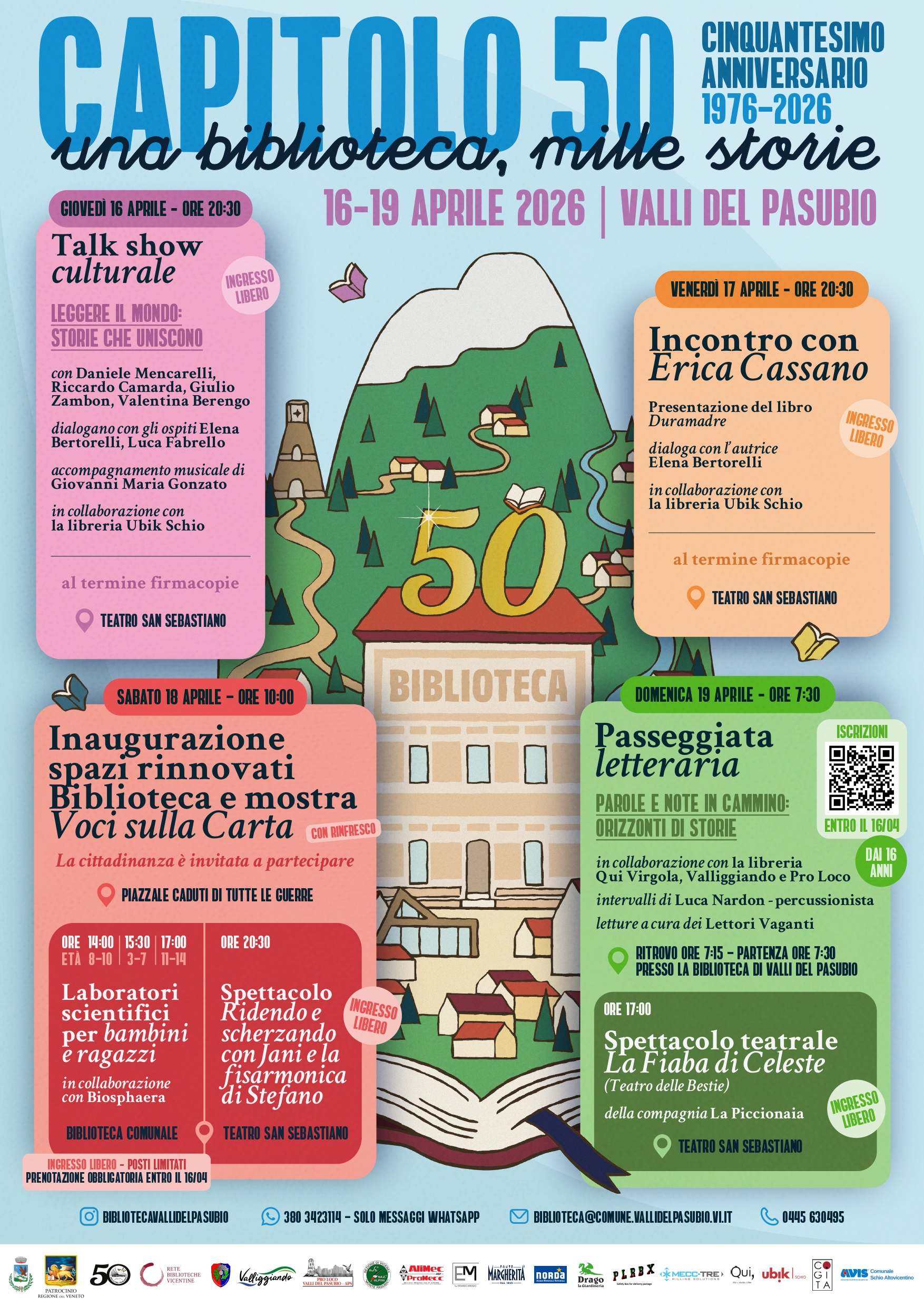 Per festeggiare i 50 anni della biblioteca, l'Amministrazione comunale e la biblioteca vi invitano a partecipare alle tante iniziative che si terranno dal 16 al 19 aprile. Talk show, incontri con autori, passeggiata letteraria, laboratori per bambini e ragazzi, cabaret e tanto altro.